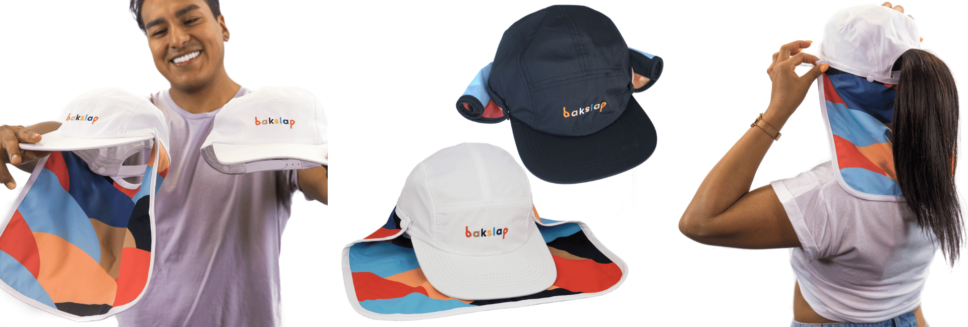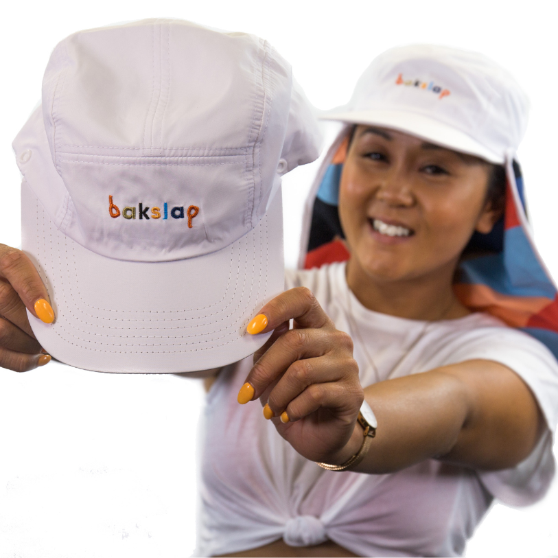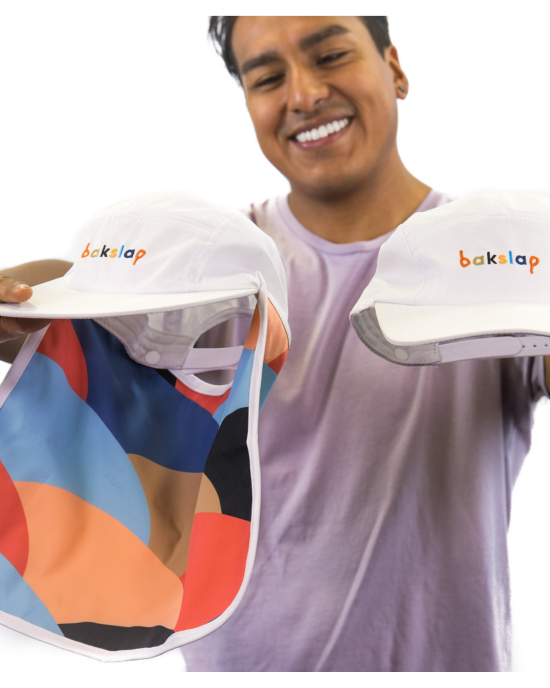 Our Custom-Made Detachable Flap Hats combine style with functionality. A one-of-a-kind design featuring a colored wave pattern, printed double-sided, and an embroidered Bakslap logo.